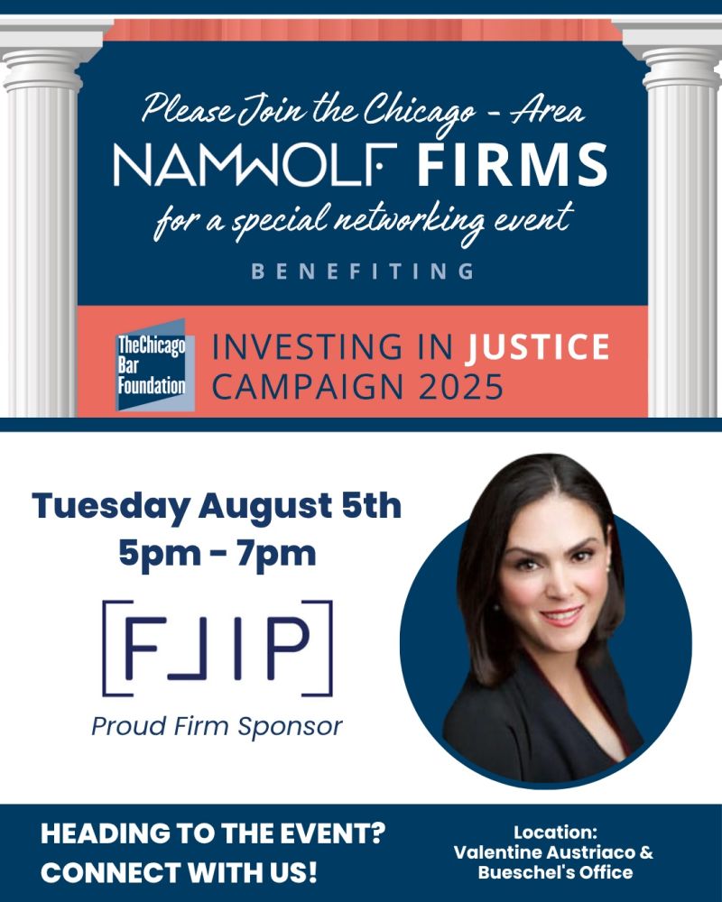 Flener IP & Business Law joined fellow Chicago NAMWOLF firms to support the Investing in Justice Campaign 2025, benefiting The Chicago Bar Foundation’s mission to improve fairness and accessibility in the justice system.